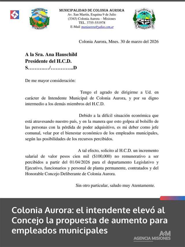 AGENCIA MISIONES.UNO | La iniciativa impulsada por el intendente Cali Goring será tratada en el Concejo Deliberante y busca acompañar a los empleados en el actual contexto económico.