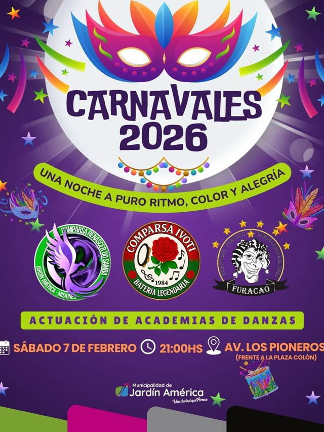 AGENCIA MISIONES.UNO | La Municipalidad de Jardín América invita a la comunidad a participar de los Carnavales 2026, que se desarrollarán el sábado 7 de febrero frente al edificio municipal.